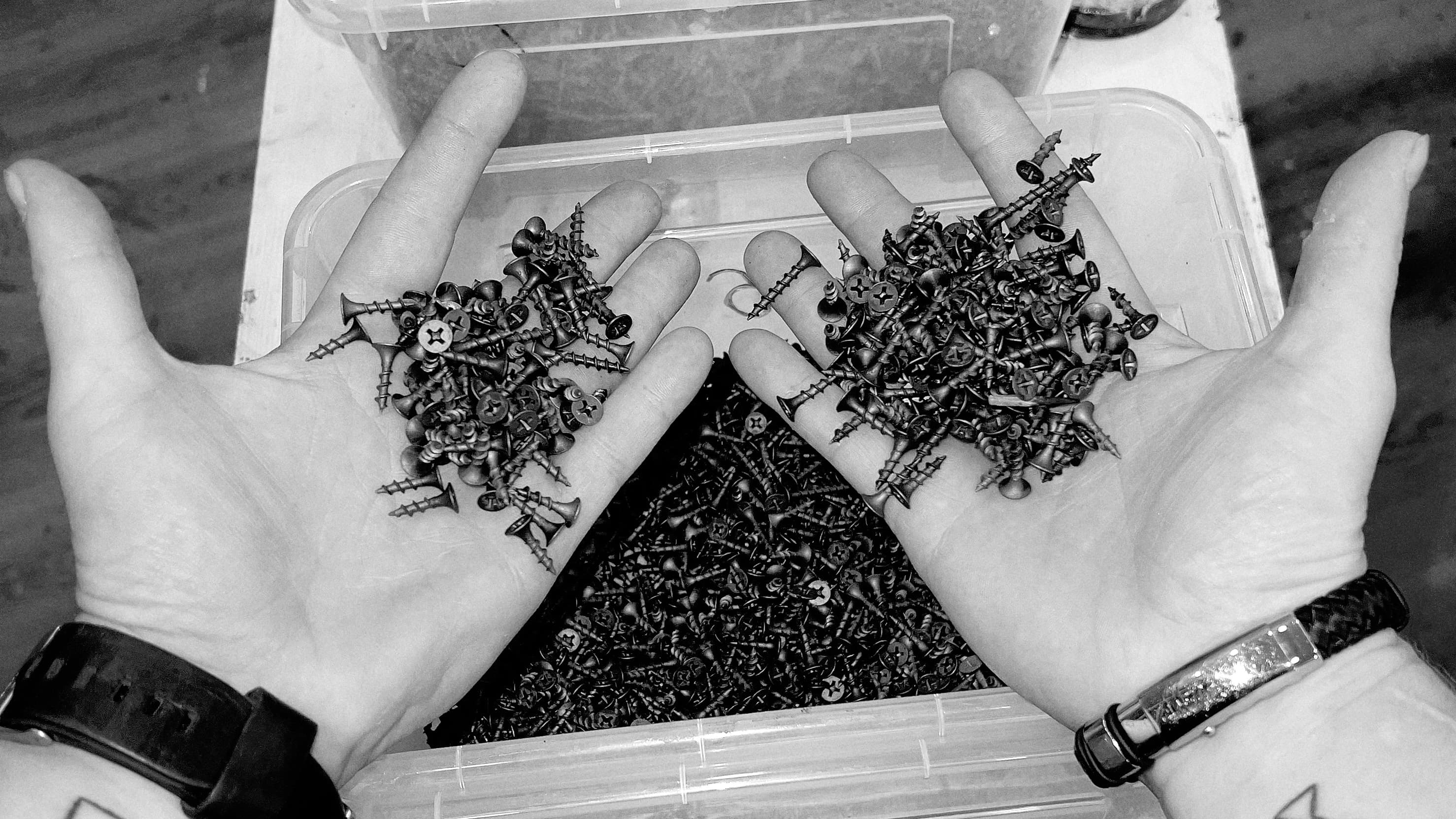 The idea of using screws in his art first took shape at one of Aleksey’s first meetings with a client. At the end of 2021 ATO Gallery commissioned a portrait, and as an experiment, it was decided to combine realist painting with screws covering only a particular part of the surface of the canvas. This assemblage technique had its origins in Aleksey’s past work but became a firm part of his method and one of his principal visual media. In addition to the considerable amount of physical effort needed to screw thousands of screws into a painting, the process of assembling a work in this way involves an expenditure of emotion. The act of pressing the screw into the surface re-channels the strong emotional impulse that Golovin feels at a specific moment. The coherence of the painted canvas is disrupted by the need to record, process, and find external space for the residual emotion. In this process figurative painting plays the role of limiter or contour chosen by the artist in order to fill it with his imagination. Let’s step back from psychoanalytical interpretations, however, and concentrate just on the screws.